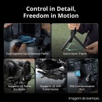 Os fotógrafos profissionais podem emparelhar o gimbal RS 5 com dois motores Focus Pro para ajustar facilmente o foco e o zoom usando os controles do dial e do joystick do gimbal. Adicione o componente de transmissão DJI SDR para obter transmissão de vídeo ao vivo e controle remoto do gimbal/câmara.