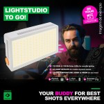 O design leve torna-a particularmente fácil de manusear. A roda de ajuste permite um controlo preciso da temperatura da cor, que pode ser monitorizada através do visor. O visor também mostra claramente o brilho atual, a temperatura da cor e o nível da bateria. Com uma operação intuitiva, pode selecionar entre 359 cores e ajustar a temperatura da cor de forma contínua entre 2500K e 9000K para simular várias condições de iluminação. Os LEDs integrados fornecem um espetro RGB completo, bem como luz fria e quente para efeitos de iluminação flexíveis.